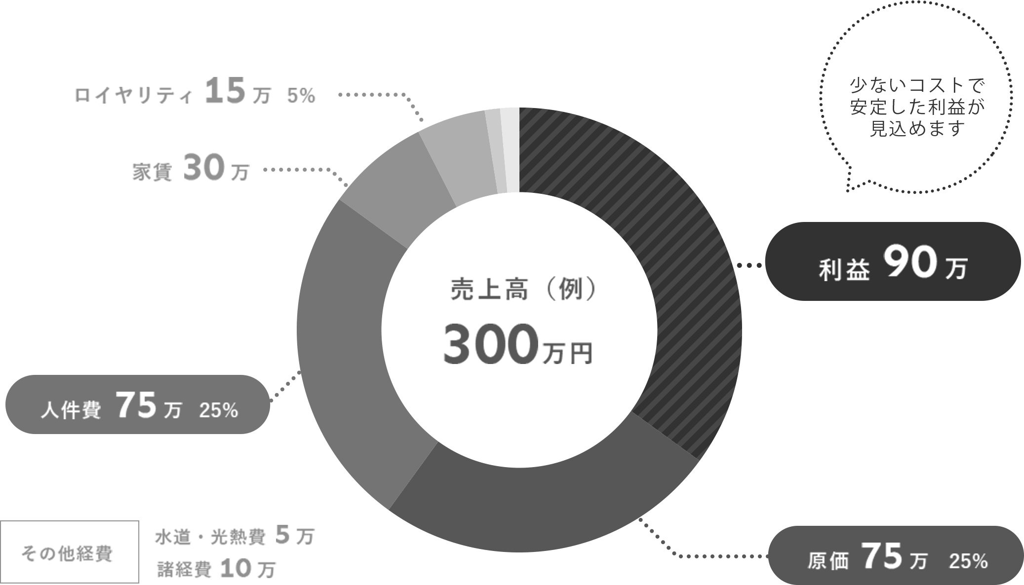 通常の飲食店に比べて、設備投資が小さく、回収が早いです。加盟金・ロイヤリティは同業他社より低い設定の為、高い利益率が特徴です。